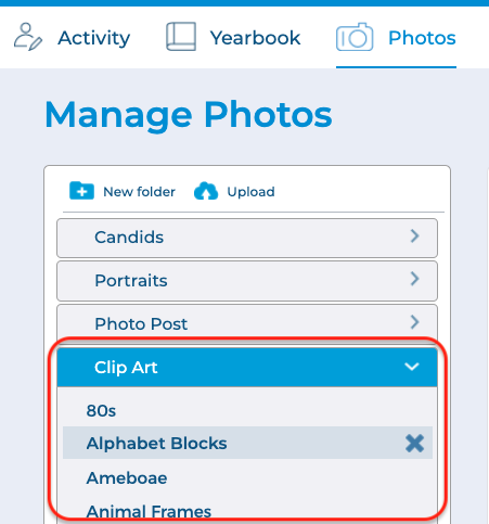 To upload your clip art from your computer, select the folder you want to upload your clip art into, then click the Upload button at the top of the tab.