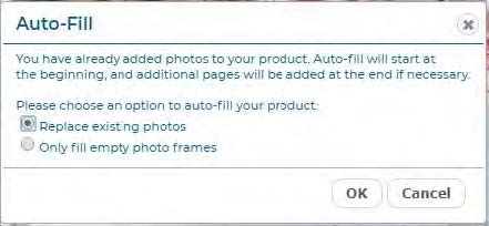 You will have the option to Replace the existing photos, or to Only fill the empty photo frames. Click the button next to your selection, then click OK. Photos will be flowed throughout the section until there are no more photos, or no more frames.
